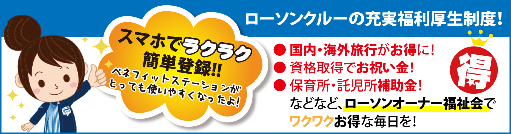社員全員に、ローソン本部と同じ充実した福利厚生サービスを用意しています。多岐にわたるジャンルのサービスを数多く揃えており、福利厚生で定番の宿泊施設、レジャー、スポーツといった分野はもちろん、グルメ、ショッピング、育児、健康、介護まで会員特典サービスが利用できます。また、雇用保険、労災保険、健康保険、厚生年金も導入しています。詳しくはローソンオーナー福祉会HPをご覧ください。